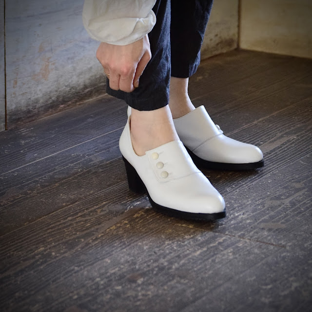 先日のイベントでもご試着が多かったボタンが3つ並んだ白いパンプス。